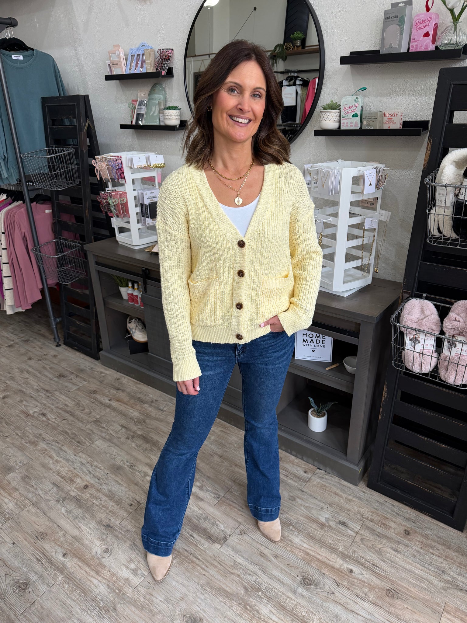 Effortlessly chic meets cozy comfort with the Diana Relaxed Drape Cardi. This slouchy sweater cardigan features a flattering V-neckline and button-down front, perfect for layering over your favorite tees. Soft light yellow knit fabric drapes beautifully while ribbed details at the cuffs and hem keep everything in place. Practical patched pockets add a playful touch—because style should never sacrifice function. Long sleeves and that perfectly relaxed fit make this your new go-to piece for casual days and weekend vibes!