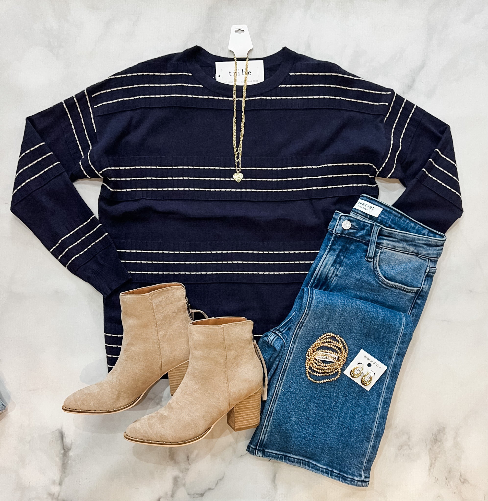 Wrap yourself in cozy charm with the Kayden Striped & Textured Sweater. Featuring playful stripe patterns and a comfy crew neck, this long-sleeve pullover adds a fun twist to your everyday look. Perfect for layering or wearing solo, it’s your new go-to for staying warm with a splash of style.