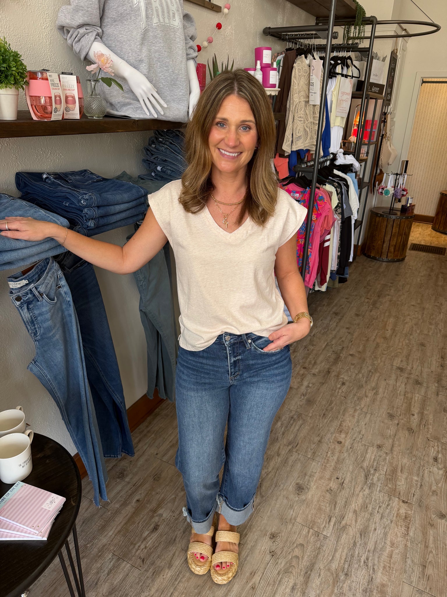 Oh-so-essential, this classic tee is featured in a so-soft cotton fabrication, V neckline and pink oatmeal knit for the perfect lived-in look.