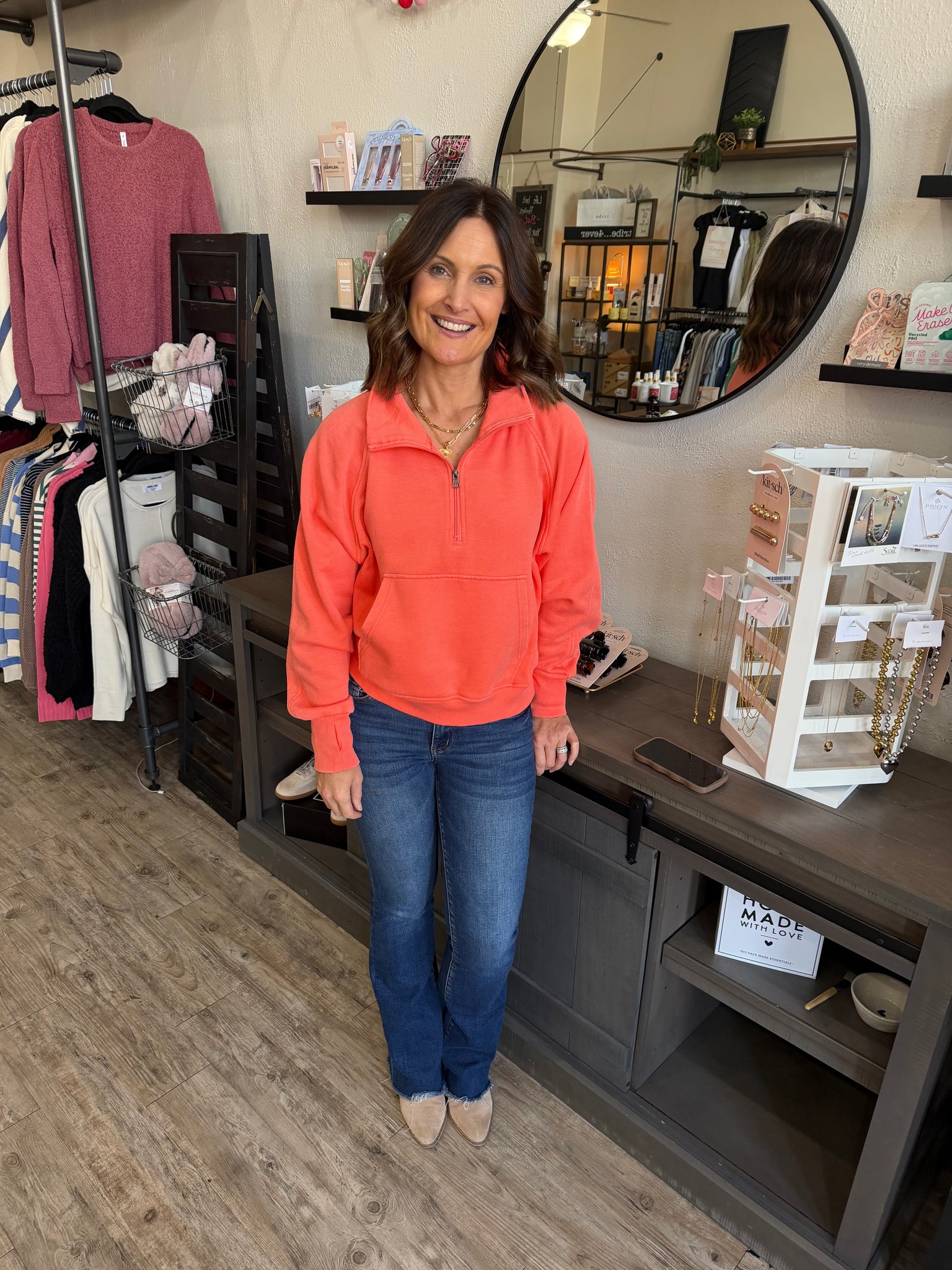 Cozy up in our Lexi Coral Quarter Zip Sweatshirt—the perfect layer for those "just right" temperature days. This cropped funnel neck style features a handy quarter zipper so you can adjust your vibe on the fly. Crafted from a comfy cotton-poly blend, it's soft enough for lounging but put-together enough for grabbing coffee with friends. Your new go-to piece awaits!
