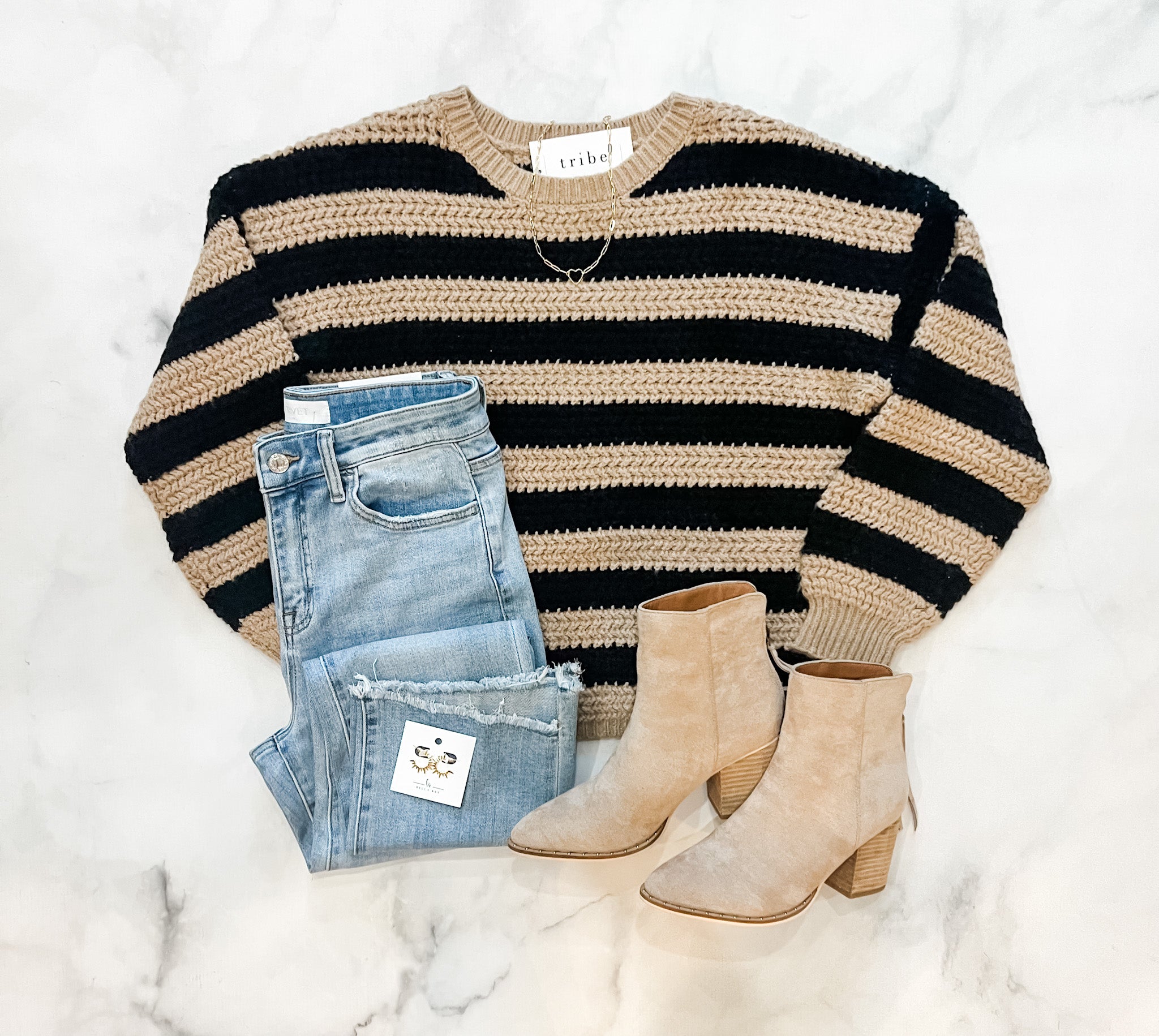 Cozy up in the Elin Relaxed Stripe Knit Sweater, featuring playful black and taupe stripes that add a fun twist to your casual look. The long sleeves with dropped shoulders create a laid-back vibe, perfect for lounging or layering on cooler days. Soft and comfy, this pullover is your go-to for effortless style with a relaxed fit!