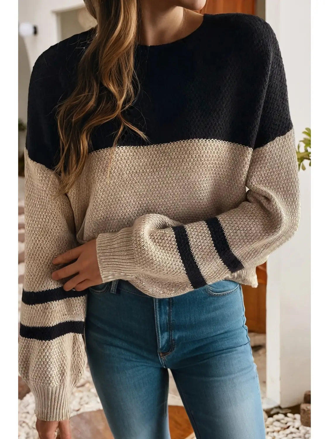 Bring a playful twist to your casual wardrobe with the Marleigh Striped Casual Sweater. Featuring a comfy round neckline and drop balloon sleeves, it offers a relaxed fit that feels light and breezy. The stylish black and mocha colorblock design adds fun contrast to your outfit, making it perfect for laid-back days and brunches with friends. Cozy meets cool in this effortlessly chic sweater!