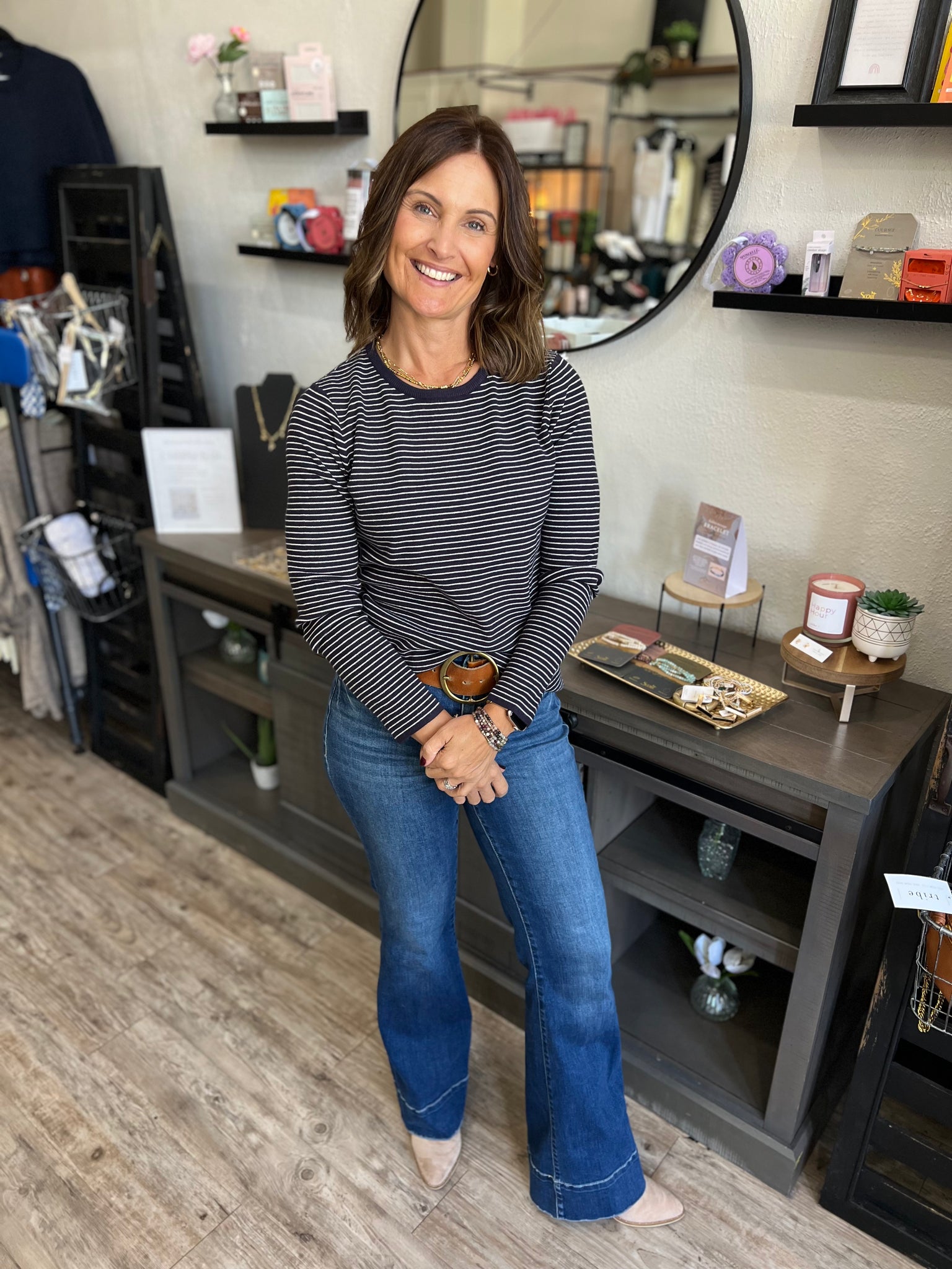 Bring a splash of fun to your wardrobe with the Maya Striped Sweater. Featuring bold navy or dark plum and white stripes, this lightweight sweater knit feels super soft against your skin. Perfect for layering, it’s ready to keep you cozy without weighing you down—ideal for playful, effortless style all day long!