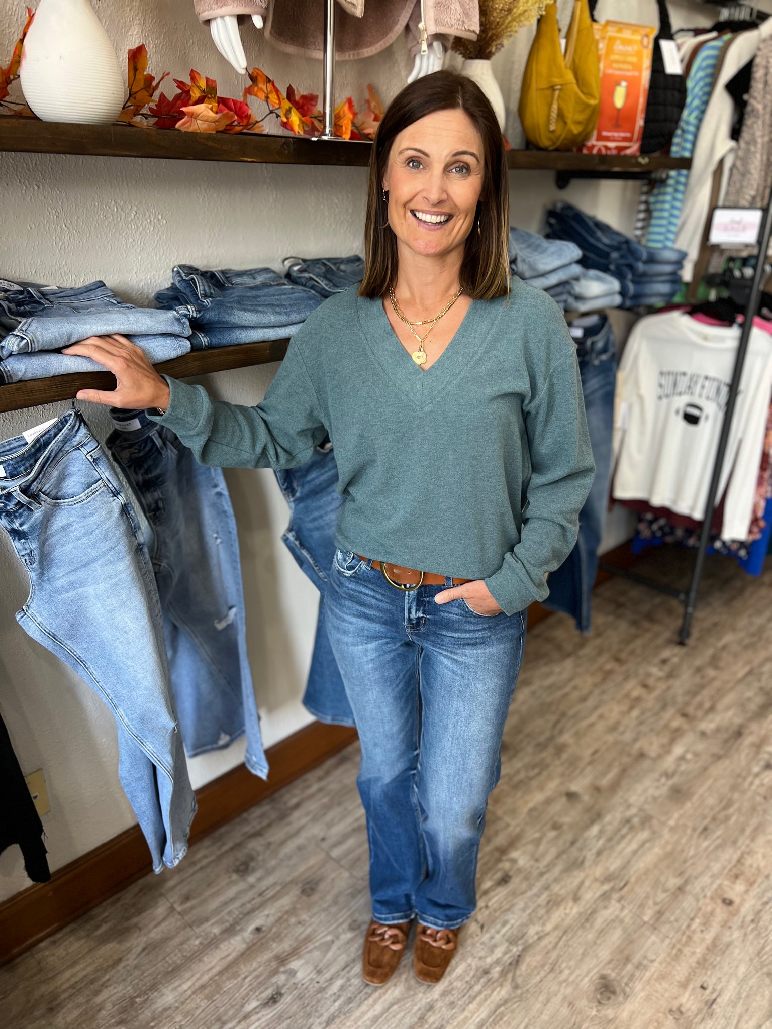 Get cozy in the Sophia V Neck Top, featuring a deep V neckline and dropped shoulders for that effortlessly cool vibe. This super soft, relaxed-fit sweater comes in two gorgeous fall colors, making it your go-to piece for laid-back days with a stylish twist. Perfect for layering or wearing solo—comfort has never looked this cute!