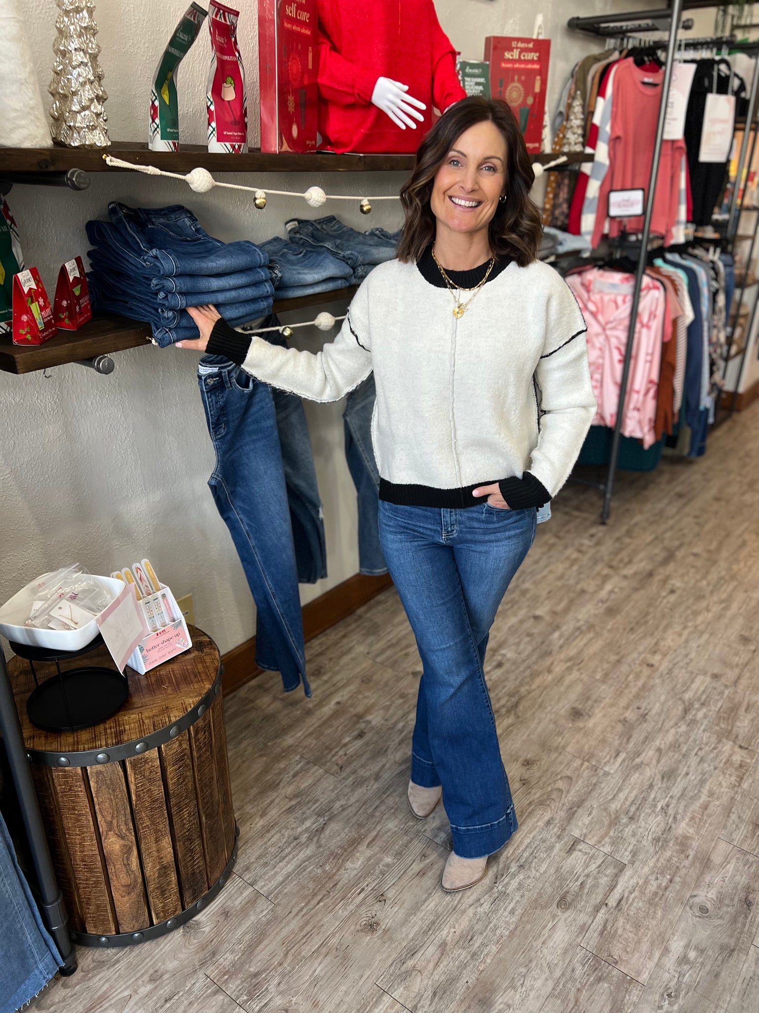 Wrap yourself in cozy comfort with the Lily Soft Sweater, a playful pullover that's as soft as a cloud. Featuring a classic round neckline and long sleeves, this sweater knit beauty gets a fun twist with eye-catching contrast banding and seam details that add personality to your everyday look. Perfect for layering or wearing solo, it's the kind of piece that makes you want to snuggle up and stay comfy all day long!
