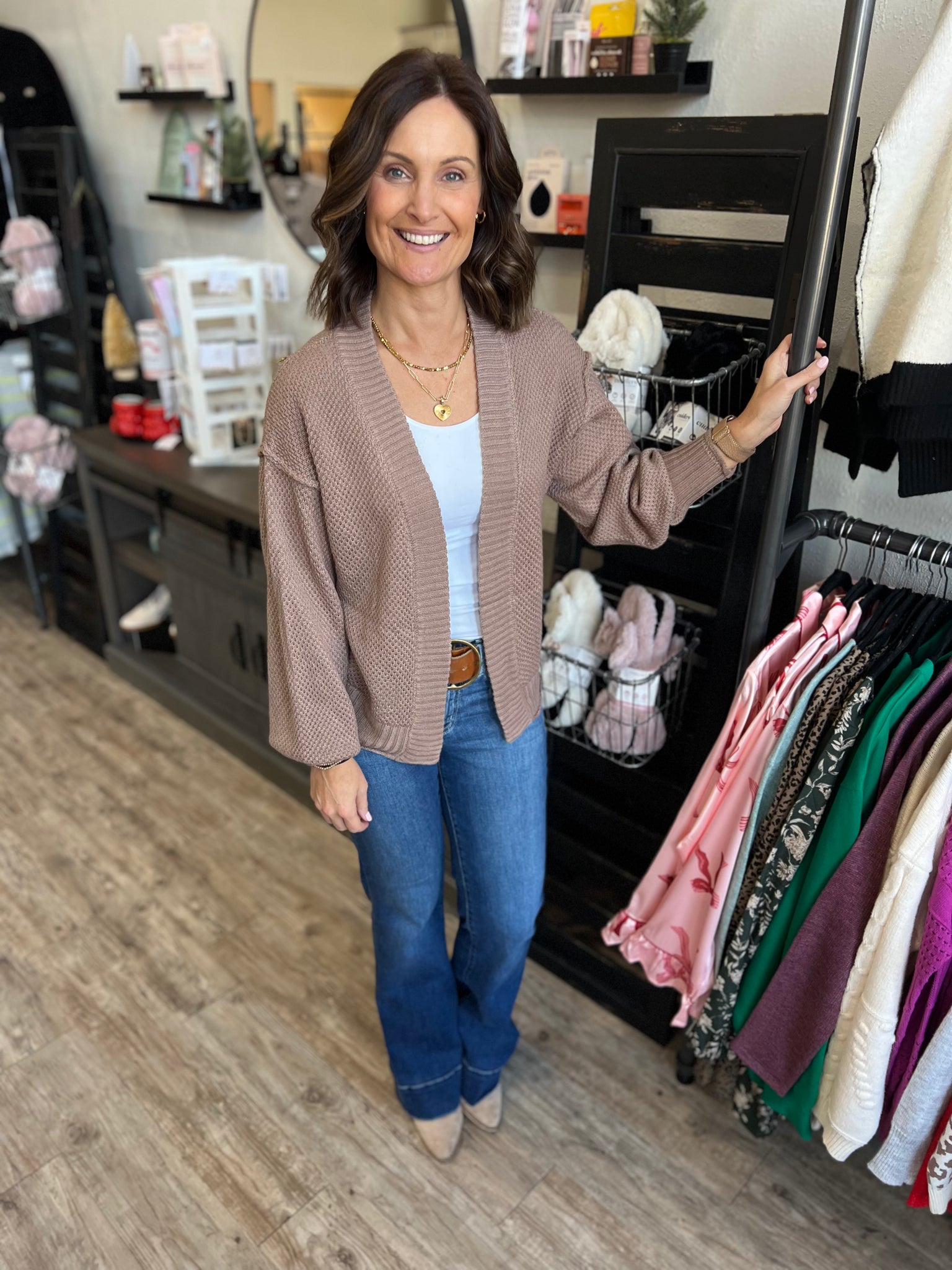 Slip into effortless style with the Presley Mocha Open Front Cardi. This cozy sweater cardigan features a textured waffle knit that adds visual interest and dimension, paired with dreamy balloon sleeves that make a statement. The open front design lets you layer it over everything from tees to dresses, giving you endless outfit possibilities. Perfect for those days when you want comfort without compromising on charm. Your new go-to piece for casual cool!